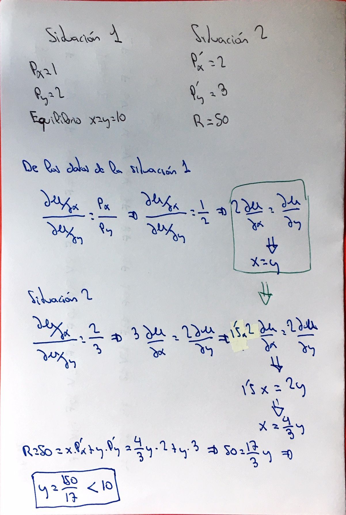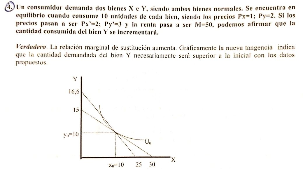 Un consumidor demanda dos bienes X e Y, siendo ambos bienes normales. Se encuentra en equilibrio cuando consume 10 unidades de cada bien, siendo los precios Px =1 y Py = 2. Si los precios se incrementan a P’x = 2 y P’y = 3 y su renta pasa a ser 50, ¿se puede afirmar que la cantidad consumida del bien Y se incrementará? Razone la respuesta.