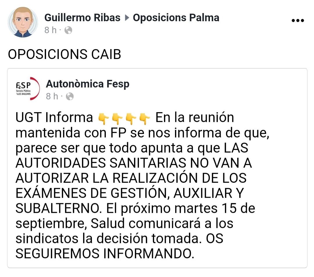 suca wrote: Han anunciado esto respecto de las oposiciones autonómicas en Baleares... Parece ser que las autoridades sanitarias no autorizan la realización de los exámenes. No sé si puede afectar también a las estatales...