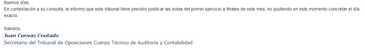 Crix94 wrote: Hola, he escrito al tribunal para saber cuando salían las notas y si está previsto que se haga en la autónoma como el otro examen y si se mantiene la fecha del segundo. Adjunto su contestación