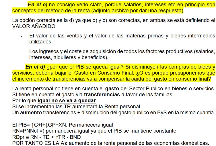 A. c) (cf = pm - Ti + Sb) ; B. d) (a y c obvian el otro componente de la fórmula - producción / población); C. ¿d)? Según mi profesora: "El VAB es igual al valor de la producción de bys menos los consumos intermedios. La b) expresa ese valor en términos de "valor" (el coste de las ventas y el coste de la MP+BIntermedios) y el c) lo expresa en términos de "ingresos menos gastos" (precio de las ventas menos el "gasto" que supone el pago de salarios, rentas...)". Entiendo que será d) pero aún no estoy seguro; D. a) (b y c no pueden ser porque en todo caso el PIB bajaría porque disminuye el gasto corriente del Estado, aunque mi profesora dice que b y c se mantienen igual y d se refiere a la inversión pública, nada que ver); E. ¿a)? Según mis apuntes del CEF, la adquisición de la vivienda no se incluye en el PIB así que por descarte debería ser la a)