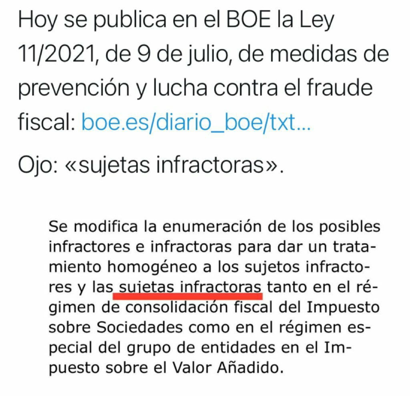 A partir de ahora, y en aras de la literalidad de la ley, a medida que se vaya incorporando nueva legislación, tendremos que memorizar, por ejemplo, lo de "sujetos infractores y sujetas infractoras"?
