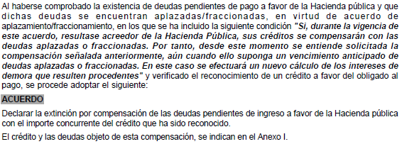 En particular, podrán establecerse condiciones por las que se afecten al cumplimiento del aplazamiento o fraccionamiento los pagos que la Hacienda pública deba realizar al obligado durante la vigencia del acuerdo, en cuantía que no perjudique a la viabilidad económica o continuidad de la actividad. A tal efecto, se entenderá, en los supuestos de concesión de aplazamientos o fraccionamientos concedidos con dispensa total o parcial de garantías, que desde el momento de la resolución se formula la oportuna solicitud de compensación para que surta sus efectos en cuanto concurran créditos y débitos, aun cuando ello pueda suponer vencimientos anticipados de los plazos y sin perjuicio de los nuevos cálculos de intereses de demora que resulten procedentes.
