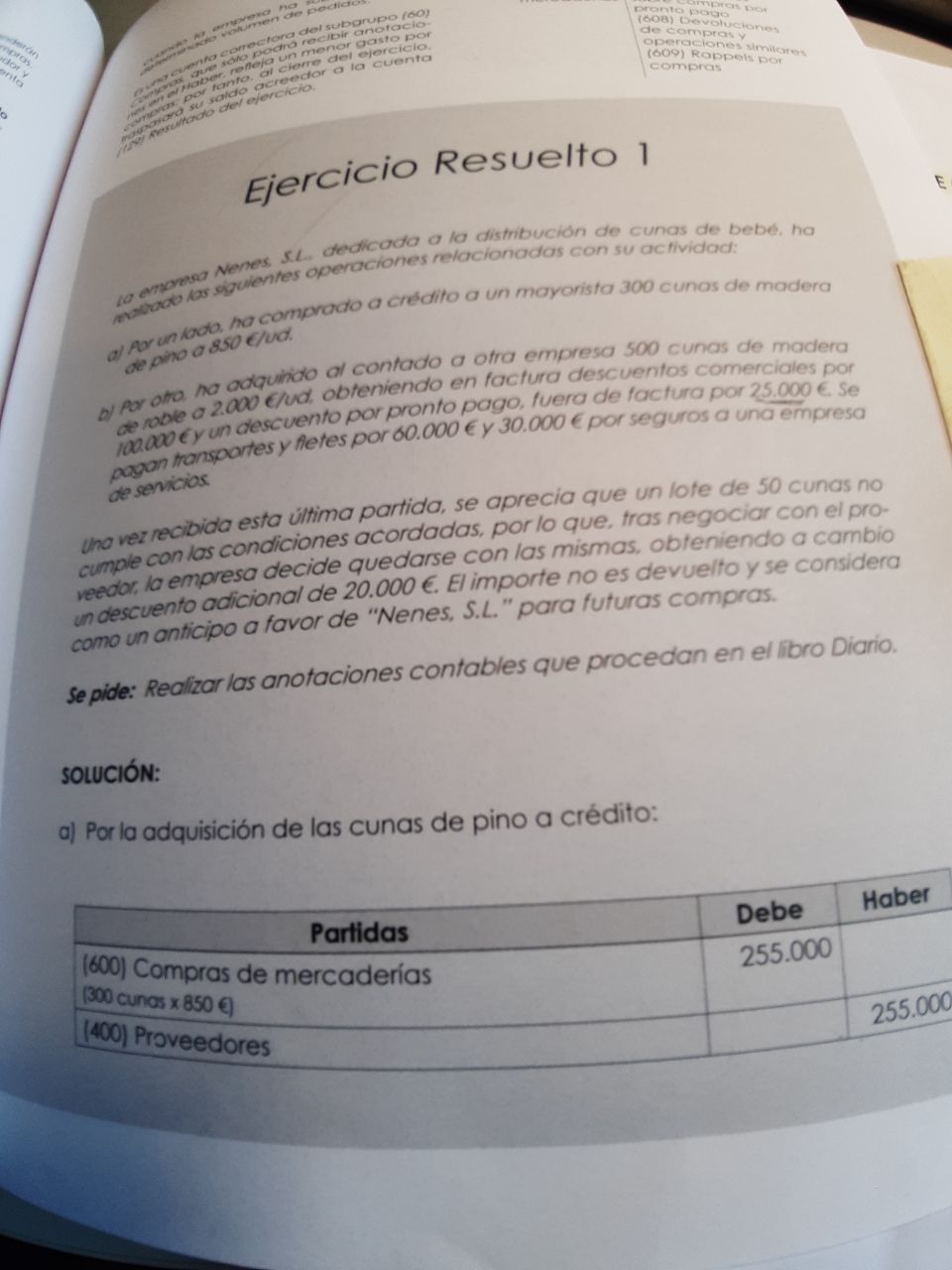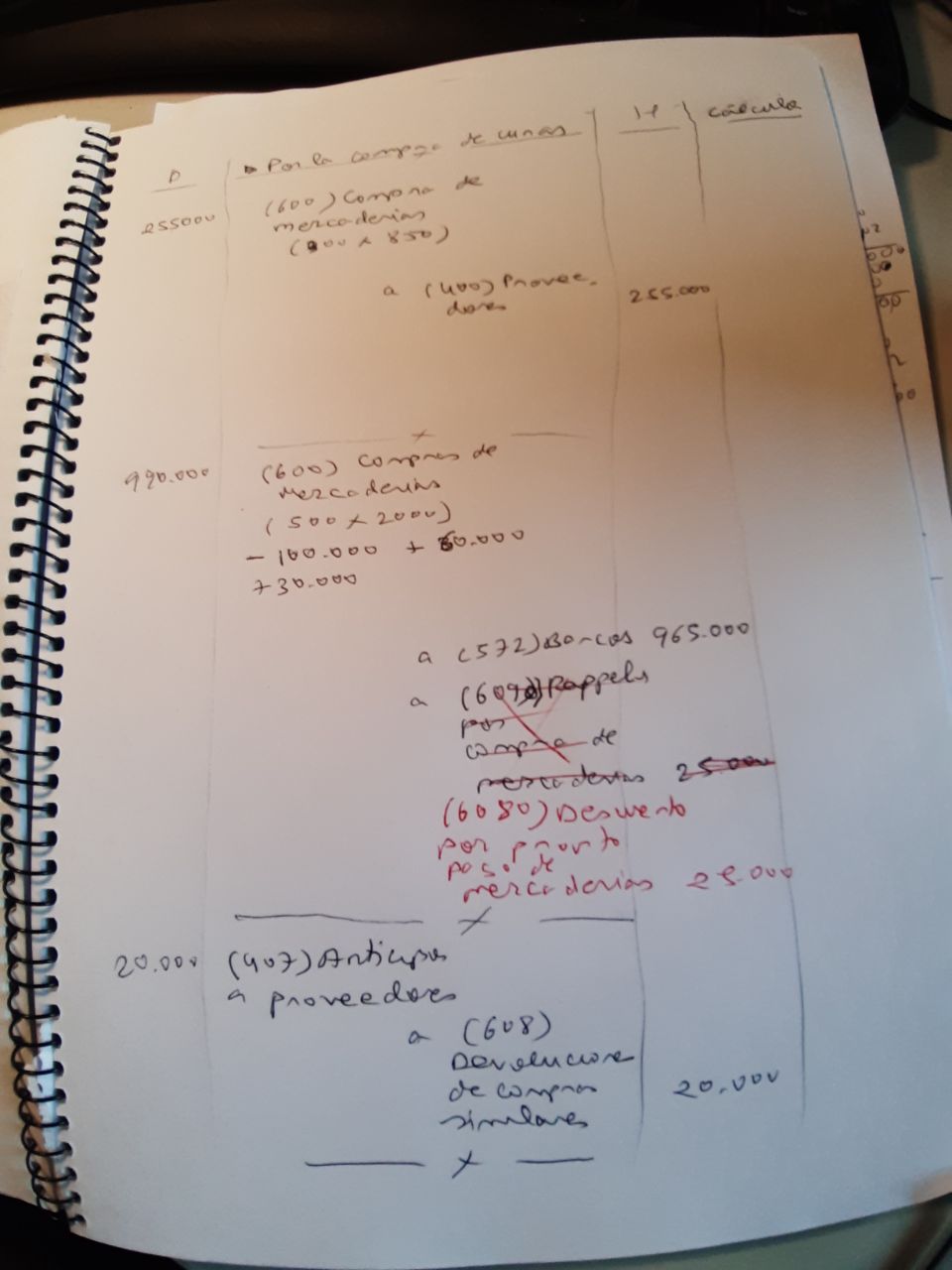 El párrafo b) nos dice que ha comprado 500 cunas a 850 € cada (500 x 850 = 100.000 euros); sin embargo nos dice que en factura ha obtenido descuentos comerciales por valor de 100.000 euros. ¿Tendríamos que minorar los 100.0000 euros de descuento en las mercaderías?, si lo hacemos así, las meraderías costaría 0 (100.000 de compras - 100.000 de descuento)?, no sé si lo interpreto bien.