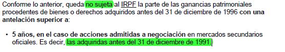Me he ido al simulador de la AEAT xa probar. Respecto a acciones admitidas a negociación, aplica correctamente la NO SUJECIÓN xa acciones adquiridas a 31/05/1991 (+5 años). Sin embargo, si pruebo con un inmueble adquirido el 01/06/1986 (+10 años) no aplica correctamente la DT9ª, sino que considera el tiempo que trancurre hasta el 31/12/1994.