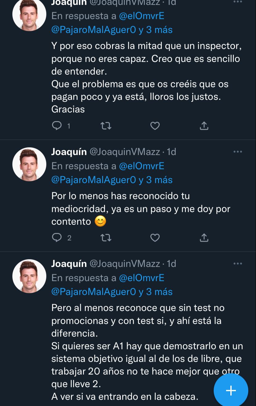 Alferdom wrote: Es DEMENCIAL que tras 6 meses de bloqueo total, las 2 opciones que se plantean ahora son convocar sin ningún cambio y hacer los exámenes a toda hostia o bien cambiar toda la oposición y esperar después del verano para juntar 3 convocatorias...