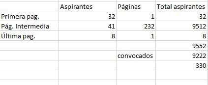 Según unos cálculos que hice chapuceros en un excel (sin tener en cuenta los que van por la cuota de discapacidad), se presentaron unas 9.552 solicitudes y se convocaron, al examen 9.222 personas. (El cálculo de las personas fue contar el número de personas que aparecían por páginas y multiplicarlas por el número de páginas.)