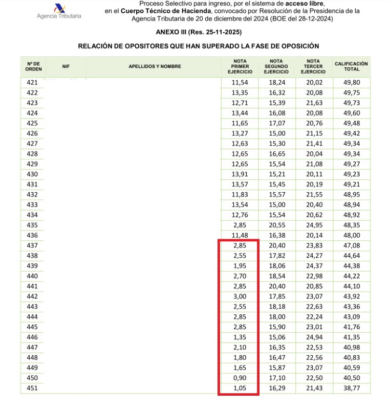 Pero creo que hay errores en el pdf de aprobados en la oposición, ¿no? Es imposible que haya gente que tenga una nota inferior a 10 en el primer examen.