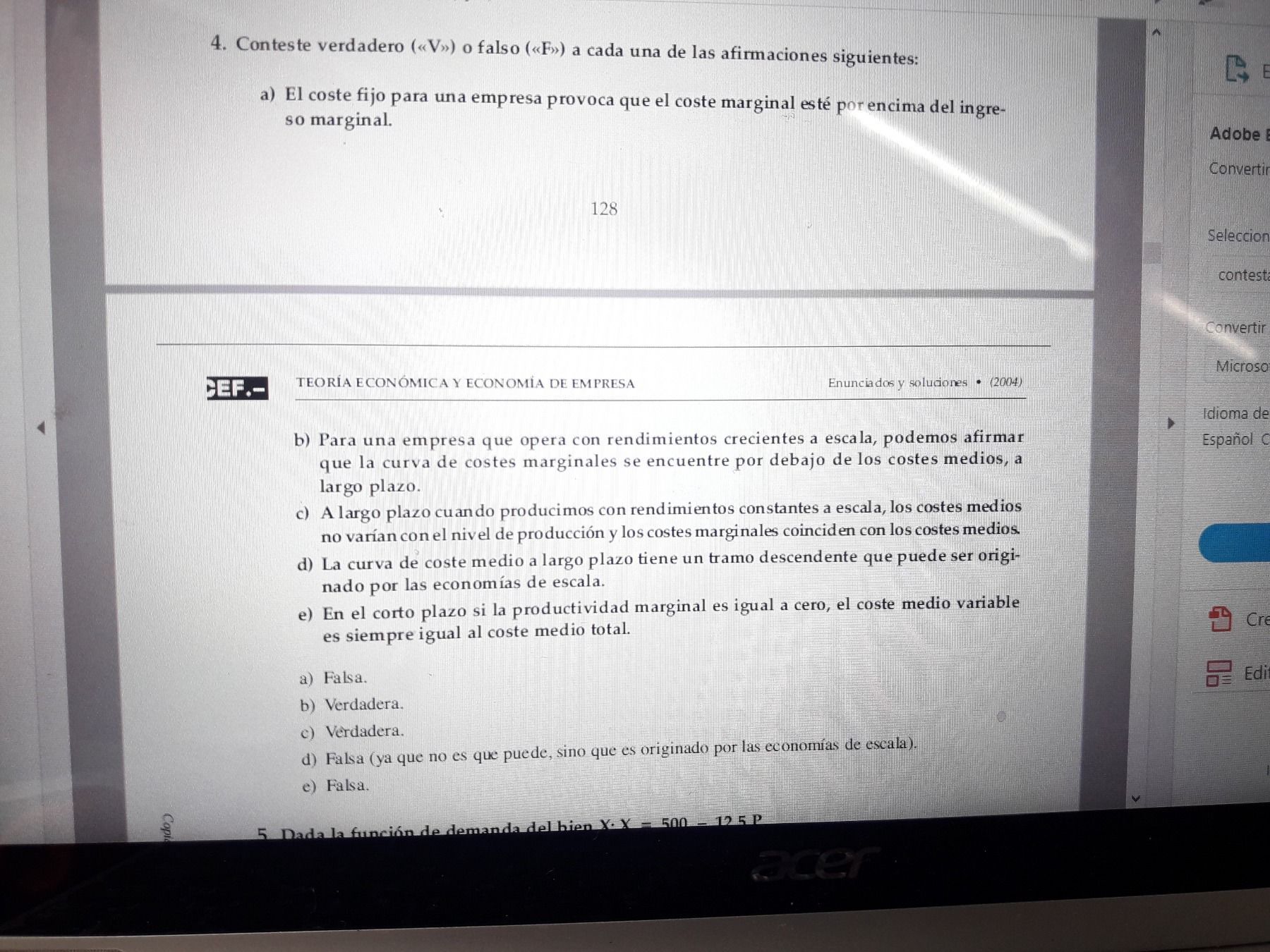 • El coste fijo para una empresa provoca que el coste marginal esté por encima del ingreso marginal FALSO