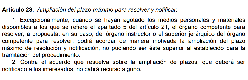 Opositiss wrote: También cabria poner, además de q lo establezca una norma con rango legal, que habiendose solicitado no sé dispone de los medios personales y materiales para resolver en plazo solicitando una ampliación del plazo al superior jerárquico u organo instructor creo que era, no?