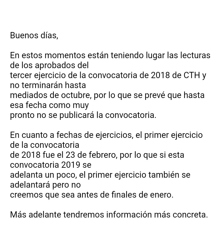 rascayusas wrote: Tengo una tesis y esa es que convocarán aún no habiendo gobierno. Pero la verdad, eso me dijo mi preparador, porque en realidad los ministros y secretarios de estado (que son los que firman) están en funciones. Pero como han dicho más arriba han habido otras convocatorias que han salido estando el gobierno en funciones. Así que, ¿quién sabe?