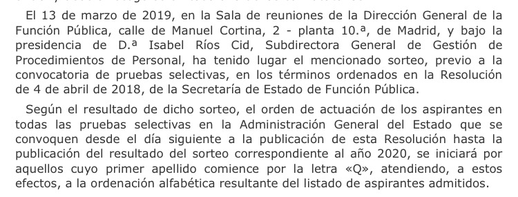 Y te han dicho bien porque así está establecido en la Orden HFP/688/2017 de 20 de julio (BOE de 22 de julio) por la que se establecen las bases comunes que regirán los procesos selectivos para el ingreso o el acceso en cuerpos o escalas de la Administración General del Estado. Si tenéis interés leed el apartado decimoséptimo "desarrollo del proceso selectivo" en el cual aparece lo de las 48 horas. Esta norma afecta a todos los procesos selectivos. De hecho los que acceden a auxiliar del Estado han de estudiarla para el examen por lo que es conveniente que la conozcáis porque os afecta a todos los candidatos a cualquier oposición del Estado. Además aunque tenga fecha del 2017 se viene modificando desde el año 2007 que fue su entrada en vigor.opositoradeprimeraño wrote: Yo sigo sin entender que esto se permita por los sindicatos. Me dijeron que pueden sacar la nota hasta 48 horas antes y me parece increíble...