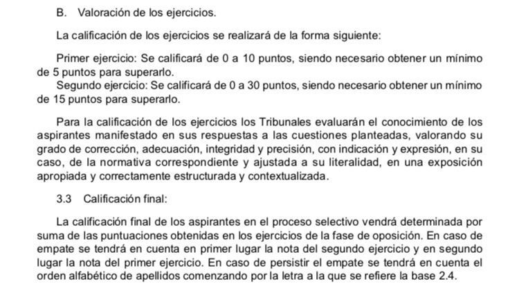 Segundo ejercicio: Se calificará de 0 a 30 puntos, siendo necesario obtener un mínimo de 15 puntos para superarlo.