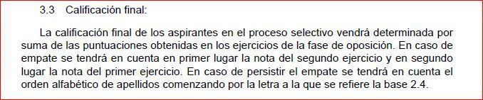 La calificación final de los aspirantes en el proceso selectivo vendrá determinada por suma de las puntuaciones obtenidas en los ejercicios de la fase de oposición. En caso de empate se tendrá en cuenta en primer lugar la nota del segundo ejercicio y en segundo lugar la nota del primer ejercicio. En caso de persistir el empate se tendrá en cuenta el orden alfabético de apellidos comenzando por la letra a la que se refiere la base 2.4