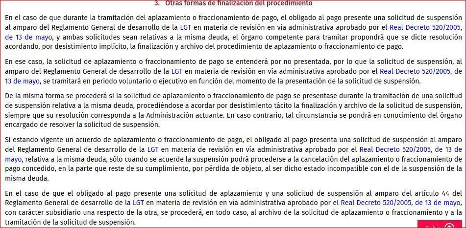 Yo entiendo que el resto del apartado de la Instruccion seguiría vigente, es decir, que se empieza a tramitar lo solicitado en primer lugar, ya sea solicitud de aplazamiento/fraccionamiento o suspensión, y si durante la tramitación el OT presenta la solicitud del otro procedimiento, se tramita el presentado en 2º lugar y se archiva el presentado en 1er lugar (x desistimiento).