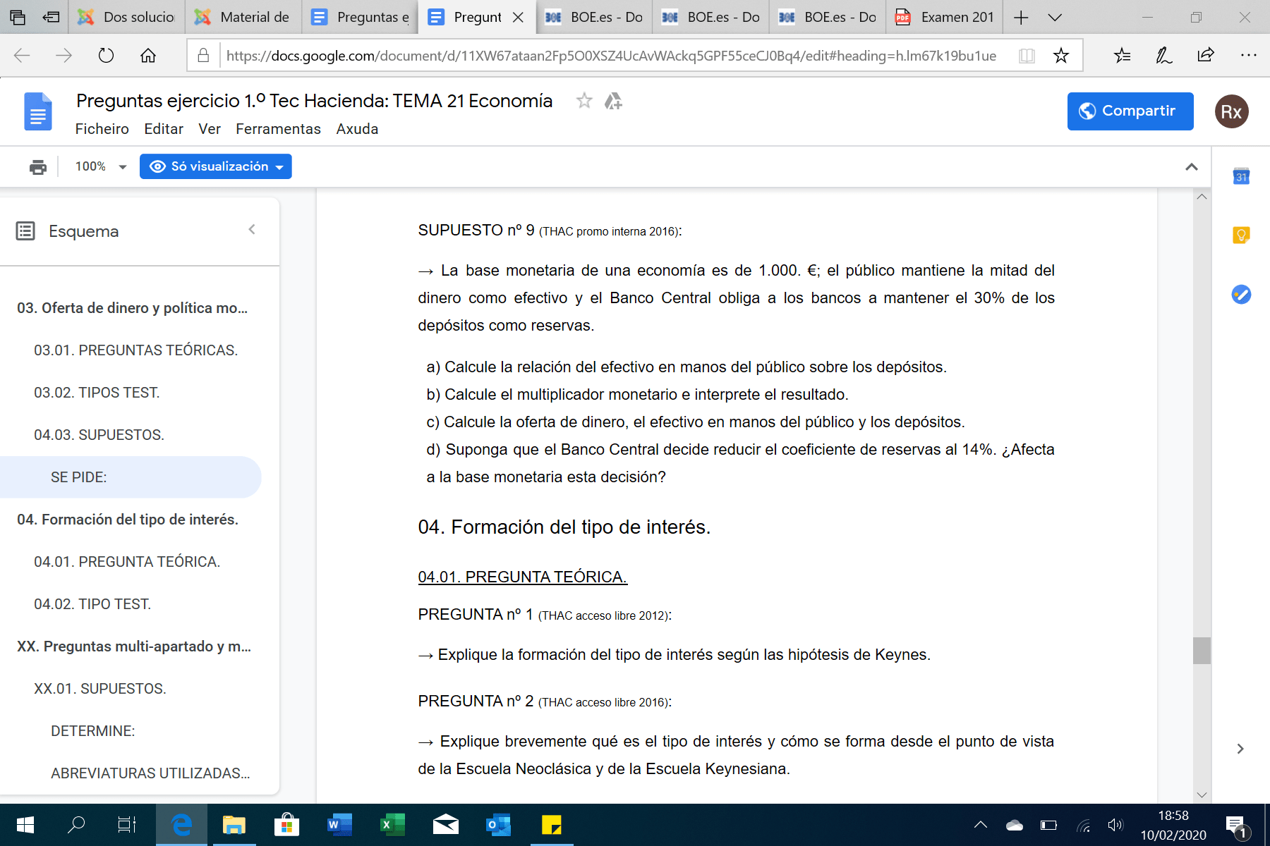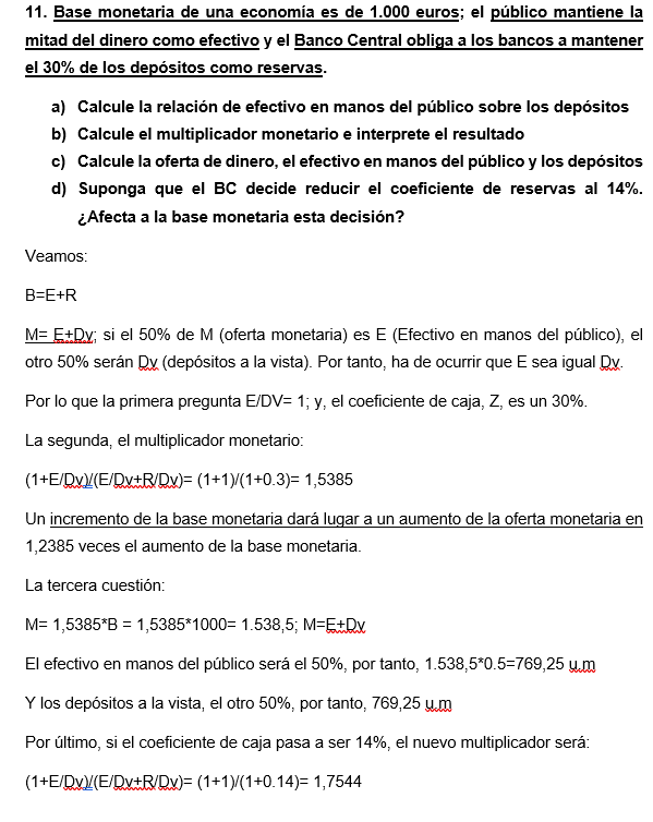 Estoy de acuerdo con la solucion de CEF pero al apartado d no contesta, solo dice el nuevo multiplicador que estoy de acuerdo, pero la pregunta es si influye en la Base Monetaria y pienso que como BM= E+R y R baja porque disminuye el coeficiente de reservas, la base monetaria disminuirá.