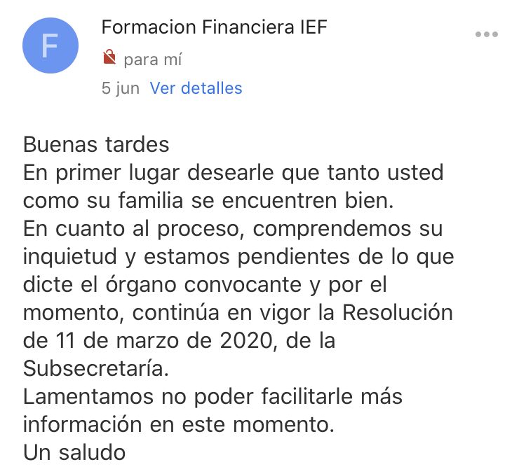 Irene wrote: Yo no sé nada. A medida que avanzan los días pienso que será a partir de septiembre. Inspectores es el 23 de julio, también en el IEF y son algo más de 400. Aduanas también se examina en el IEF la segunda quincena de julio. Puede que nos pongan el examen la primera semana de julio.... Pero si es así, deberían haberlo organizado ya y deberían haber emitido también algún comunicado. Aunque en la resolución de paralización el plazo mínimo para avisar creo que ponía 15 días, el resto de las oposiciones de Hacienda y que se organizan en el IEF aunque dependan de la AEAT, están avisando con bastante más margen de 15 días. Las personas nos debemos organizar para llegar al examen y dada la situación tan excepcional que estamos viviendo, deberían ser considerados. Pero también soy consciente que todo es posible.